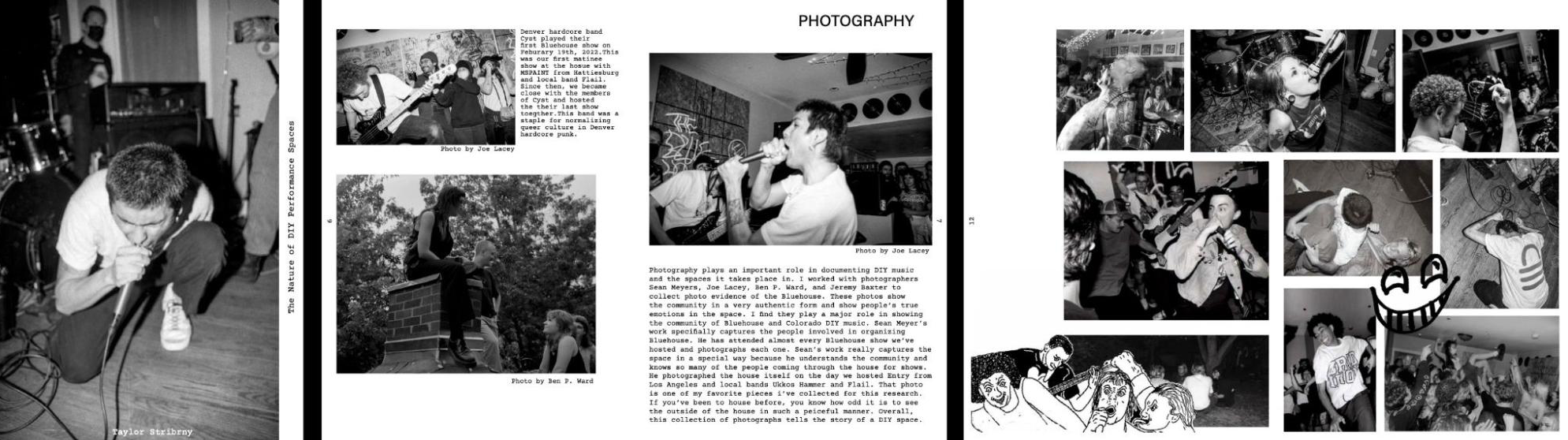 Example Student Work: In her 2022 Zine, The Nature of DIY Performance Spaces (above), DIY Music Organizer Taylor Stribrny turns her research inward to reflect upon her role as the organizer of the BlueHouse music venue and how punk & DIY art spaces create community.